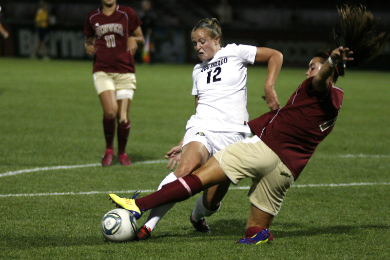 Sophomore forward Carly Bolyard fights for the ball inside the box during a game against the University of Denver at the DU Invitational on Friday, September 7th. The Buffs lost their first game of the season, 4-1. (CU Independent/Kai Casey)
