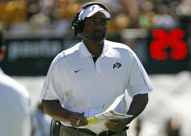 Colorado head coach Jon Embree watches a replay on the video board during the second half of Saturday’s 28-30 loss to Sacramento State. (CU Independent/James Bradbury)
