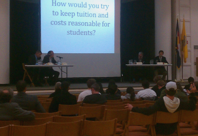 A sparse crowd in the Glenn Miller Ballroom listens to CU Regents Stephen Ludwig (D) and Brian Davidson (R) debate Wednesday night. (CU Independent/Alison Noon)