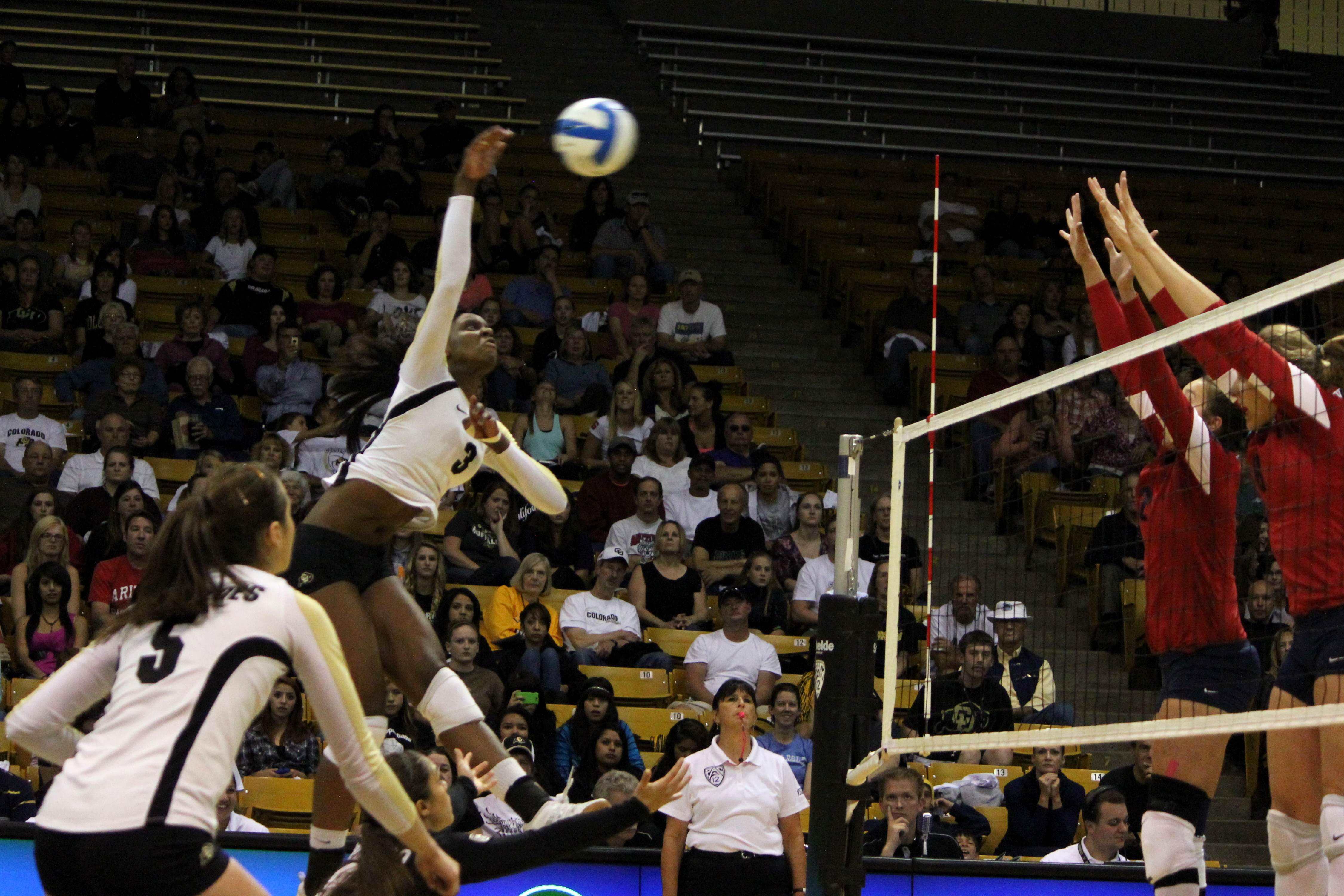 Alexis Austin hits the ball towards Arizona defenders in a PAC-12 game on Sunday at the Coors Events Center. Austin finished with a team-high 11 kills in the game. (CU Independent/Kai Casey)