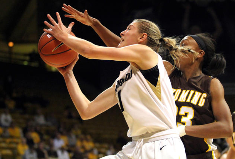 Sophomore guard Lexy Kresl attempts a lay-up against Wyoming’s Chaundra Sewell during a game on Nov. 28, 2012 at the Coors Events Center. Kresl finished with 8 points and 4 steals. (Kai Casey/CU Independent)