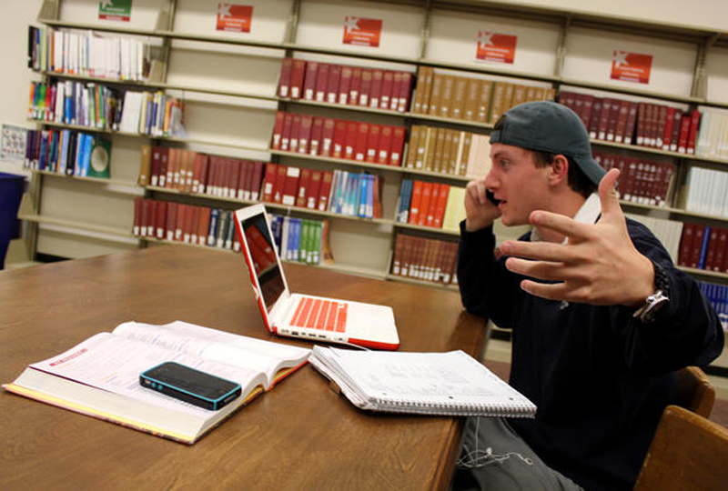 Sophomore sociology major Alec Jenkins, 20, demonstrates an annoying student in Norlin Library. (Kai Casey/CU Independent)