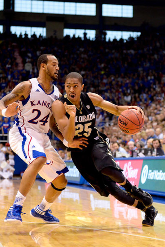 Spencer Dinwiddie, against Travis Releford late in the second half against Kansas. Colorado defeated Fresno State University 50-43 Wednesday night. (Andrew Kaczmarek/CU Independent)