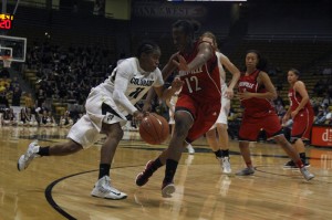 Junior guard Brittany Willson 11, works to dribble past the Louisville Cardinal forward Shawnta’ Dyer 12. The Buffs defeated the numer 8 ranked team 70-66. (Amy Leder/CU Independent)