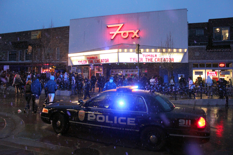 A Boulder Police car sits in front of the Fox Theater as hundreds of people wait in line for the free Tyler the Creator show on Monday, March 11, 2013. Dozens of police officers responded to disturbance from the crowd after an altercation broke out in front of a restaurant down the street. (Kai Casey/CU Independent)