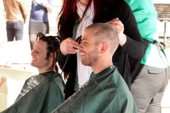 CU students participate in St. Baldrick’s day in front of the UMC fountians on Wednesday. (Haleigh Jacobson/CU Independent).