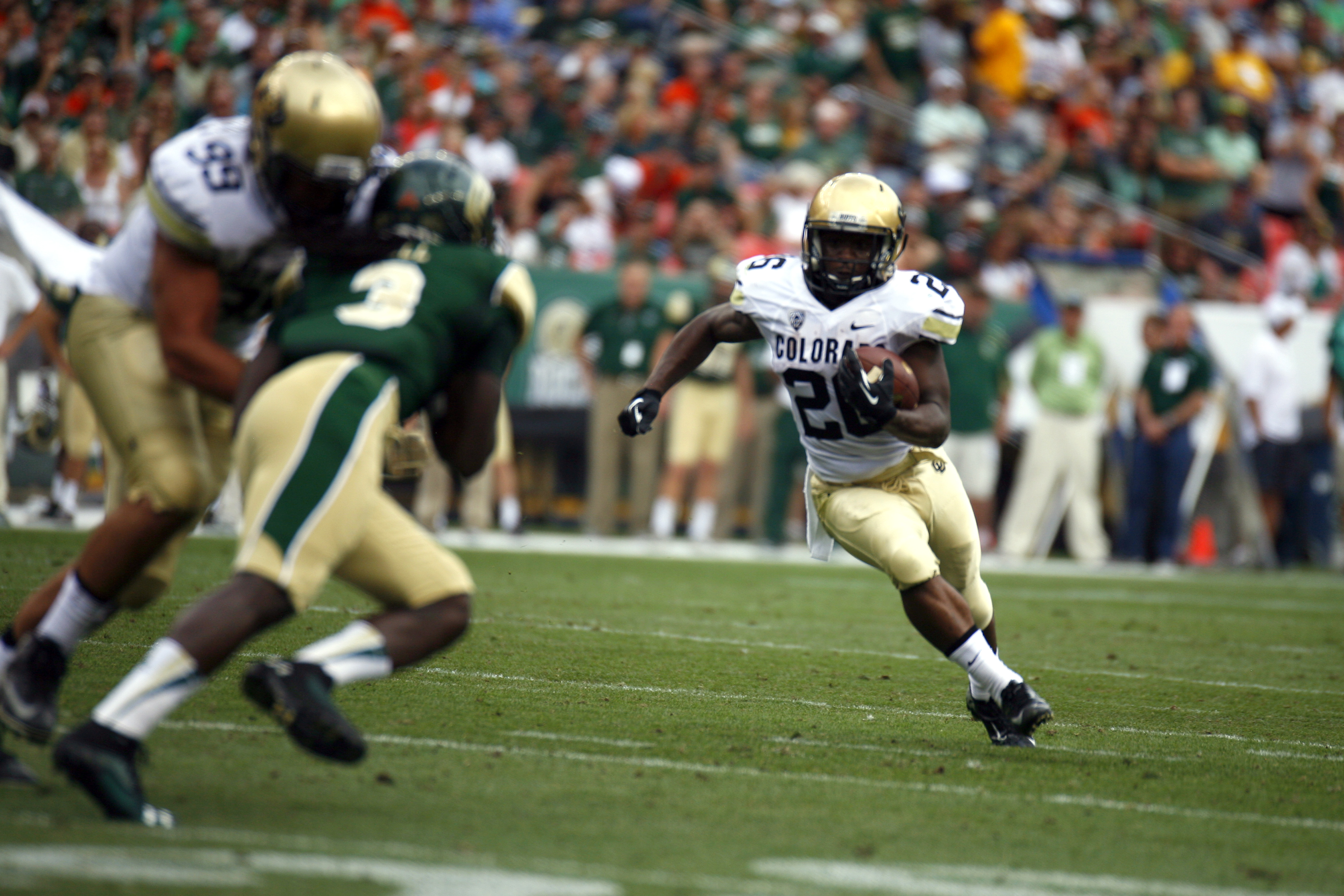 Junior Tony Jones runs the ball as his teammate senior tight end Scott Fernandez holds off the CSU defender Shaq Bell. (James Bradbury/CU Independent)