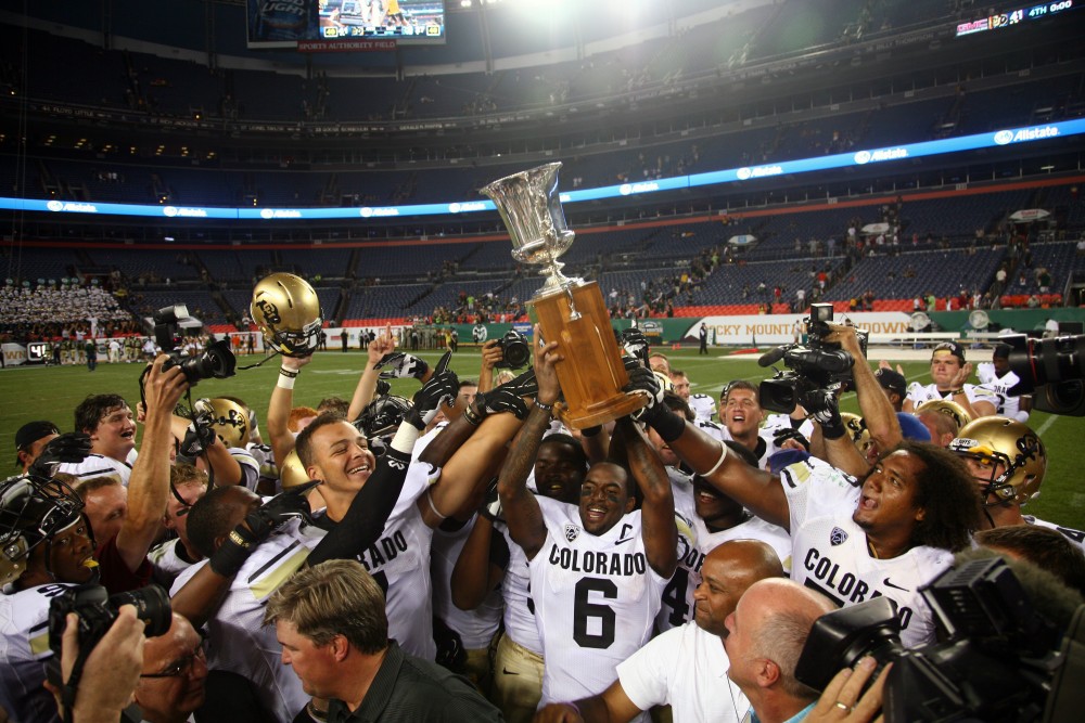 Junior Paul Richardson holds up the trophy awarded to the winner of the Rocky Mountain Showdown. The Buffs defeated the Rams 41-27. (James Bradbury/CU Independent)