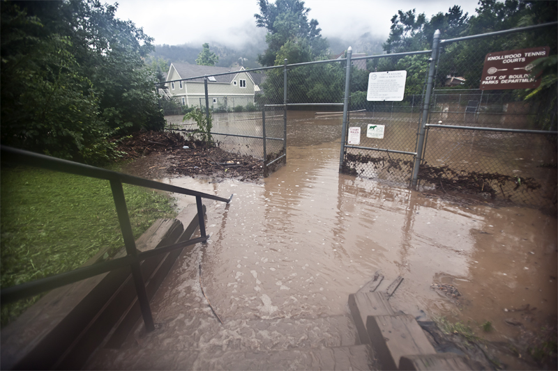Knollwood Tennis Courts just west of the Pearl St. Mall completely submerged after intense flooding Thursday afternoon. (Nate Bruzdzinski/CU Independent)