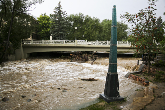 The flooded Boulder Creek is seen from the Broadway overpass, Saturday, Sept. 14, 2013. High amounts of rain water caused severe flooding and some evacuations in various parts of Colorado, but minimal rain the past two days has helped keep the flooding down. (Kai Casey/CU Independent)