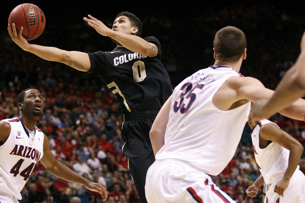 Askia Booker of Colorado attempts a layup between Soloman Hill (44) and Kaleb Tarczewski (35) of Arizona during a Pac-12 Tournament game at the MGM Grand Garden Arena in Las Vegas on Thursday, March 14, 2013. (Kai Casey/CU Independent)