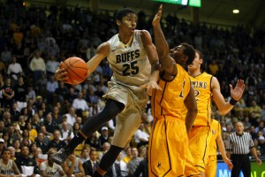 Spencer Dinwiddie (25) passes around Wyoming’s Charles Hankerson Jr. (1) Nov. 14, 2013. (Kai Casey/CU Independent)
