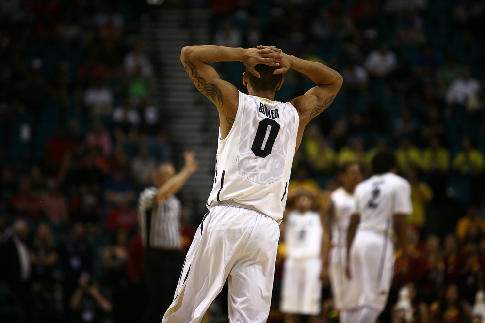Colorado’s Askia Booker (0) puts his hands on his head in disbelief of a call made by the referees during a first-round Pac-12 Tournament game between Colorado and Southern California on Wednesday, March 12, 2014, at the MGM Grand Garden Arena in Las Vegas, Nev. (Kai Casey/CU Independent)