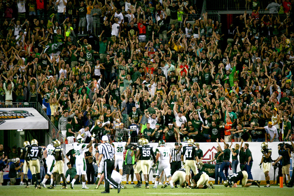 Colorado State fans cheer as the Rams score late in the fourth quarter of their 31-17 victory over the Colorado Buffaloes on Friday, August 29, at Sports Authority Field in Denver. (James Bradbury/CU Independent)