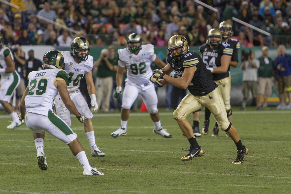 Sophomore tight end Sean Irwin turns upfield and brings the ball into CSU territory. Irwin finished with 2 catches for 19 yards. (Matt Sisneros/CU Independent)