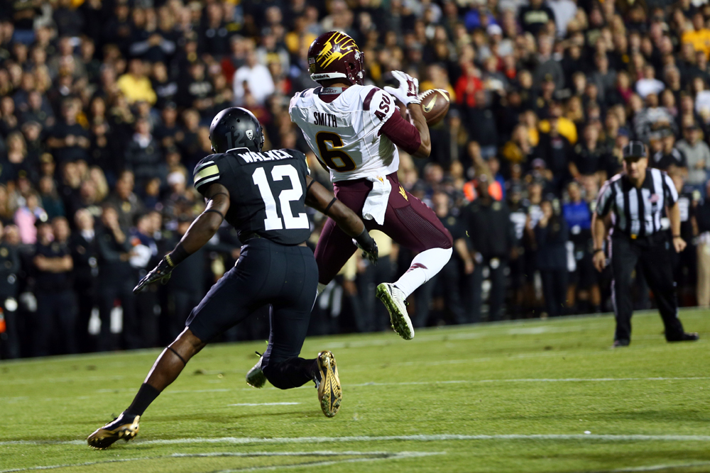 Arizona State wide receiver Cameron Smith (6) fails to haul in a pass in front of Colorado defensive back John Walker (12). (Nigel Amstock/CU Independent)