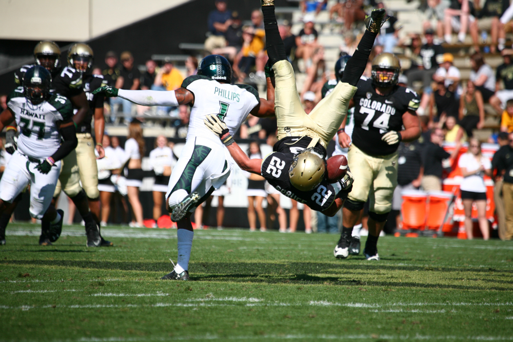 Stopping the run was still a struggle for Colorado as it has been all year. Hawaii running back Steven Lakalaka ran for 123 yards on 19 carries. The secondary had itself a game, though. Senior cornerback Greg Henderson had a sack, forced fumble and fumble recovery all in one play in the first quarter and sophmore defensive back Tedric Thompson sealed the game with an interception late in the fourth quarter. Hawaii couldn’t get anything going in the passing game thanks to Thompson and Henderson’s efforts. Junior cornerback Kenneth Crawley also had some pass deflections.