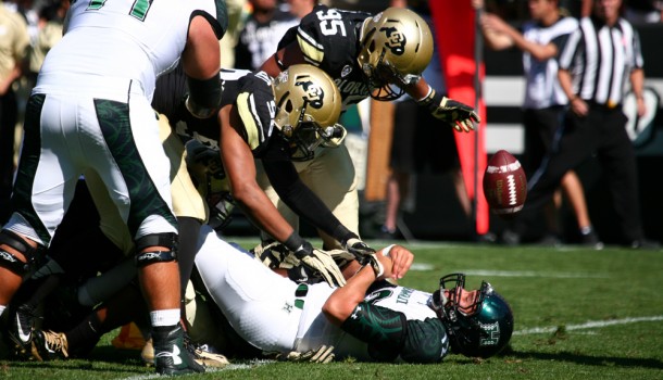 Hawaii quarterback Jeremy Higgins loses the ball after being hit by Colorado’s Jimmie Gilbert (98) and Derek McCartney (95) Saturday, Sept. 20 at Folsom Field in Boulder, Colo. The Buffs won 21-12. (Kai Casey/CU Independent)