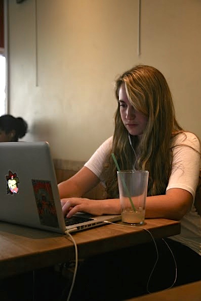 Allie Popolow, sophomore psychology major, works on her computer at the Innisfree Poetry Bookstore & Cafe on Sept. 30, 2014, in Boulder, Colo. Popolow has recently become a regular at Innisfree. “I like the coffee and it has a really good atmosphere,” Popolow said. (Sarah Meisel/CU Independent)