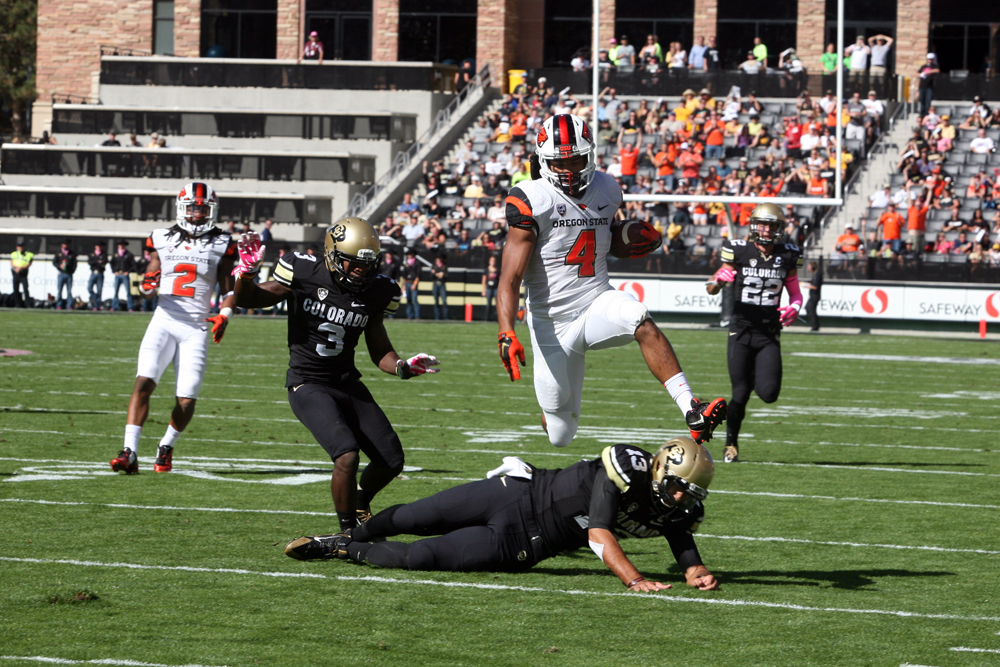 Oregon State senior linebacker D.J. Alexander (4) hurdles Colorado sophomore quarterback Sefo Liufau (13) after his interception. (Allie Greenwood/CU Independent)