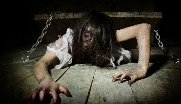 A “possessed girl” crawls across the wooden floor at the 13th Floor Haunted House in Denver, Colorado. The haunted house is located at 4120 Brighton Blvd. (Photo Courtesy of Kaitlyn Jaffke/13th Floor Haunted House)
