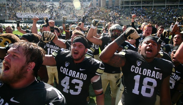 Colorado freshman fullback George Frazier (18) and teammates sing the fight song after beating Hawaii during an NCAA football game between the Colorado Buffaloes and the Hawaii Rainbow Warriors Saturday, Sept. 20, 2014 at Folsom Field in Boulder. (Kai Casey/CU Independent)