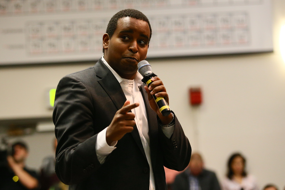 CU Regent and Democratic candidate for Colorado Secretary of State Joe Neguse addresses a packed crowd in Chem 140 at the start of a Udall campaign event. Neguse is running to replace Scott Gessler as the next Colorado Secretary of State. (Nigel Amstock/CU Independent)