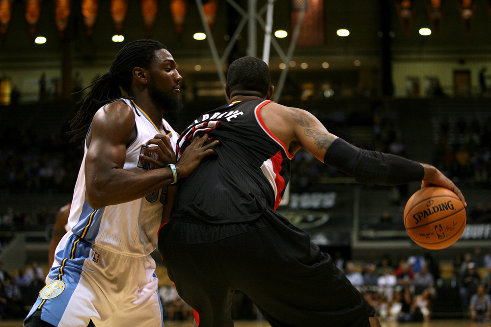 Portland Trail Blazers forward LaMarcus Aldridge backs down Denver Nuggets forward Kenneth Faried. Aldridge finished with a game-high 20 points in the win. (Kai Casey/CU Independent)