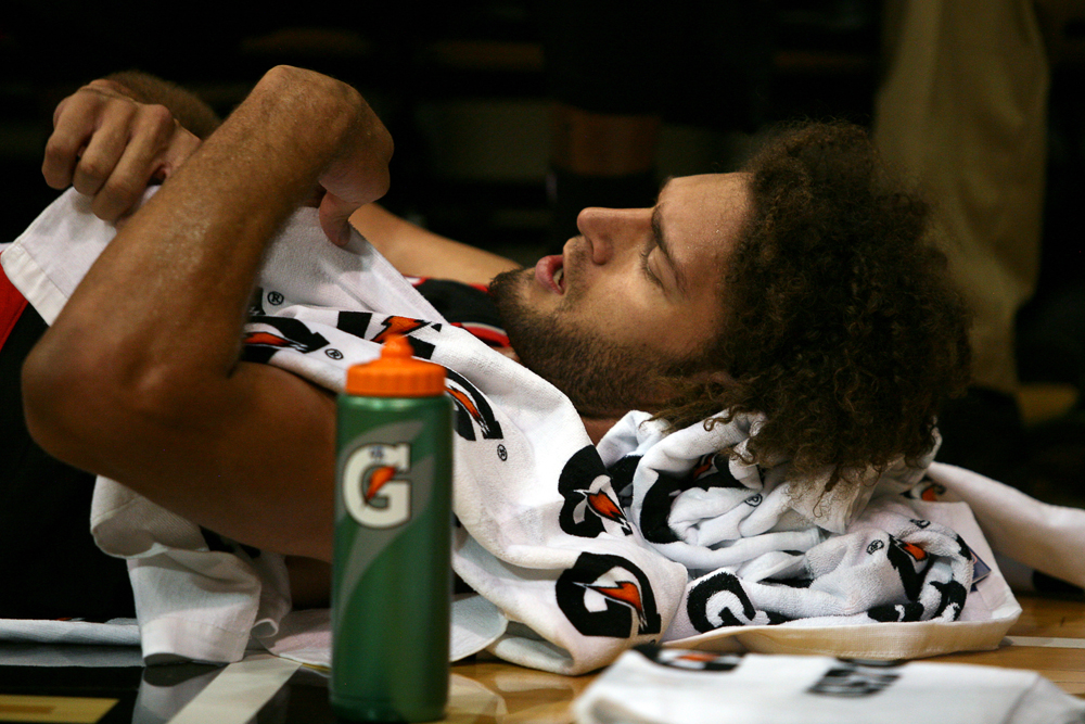Portland Trail Blazers center Robin Lopez rests on the sideline with a pillow made of towels. Lopez grabbed a game-high 12 rebounds. (Kai Casey/CU Independent)