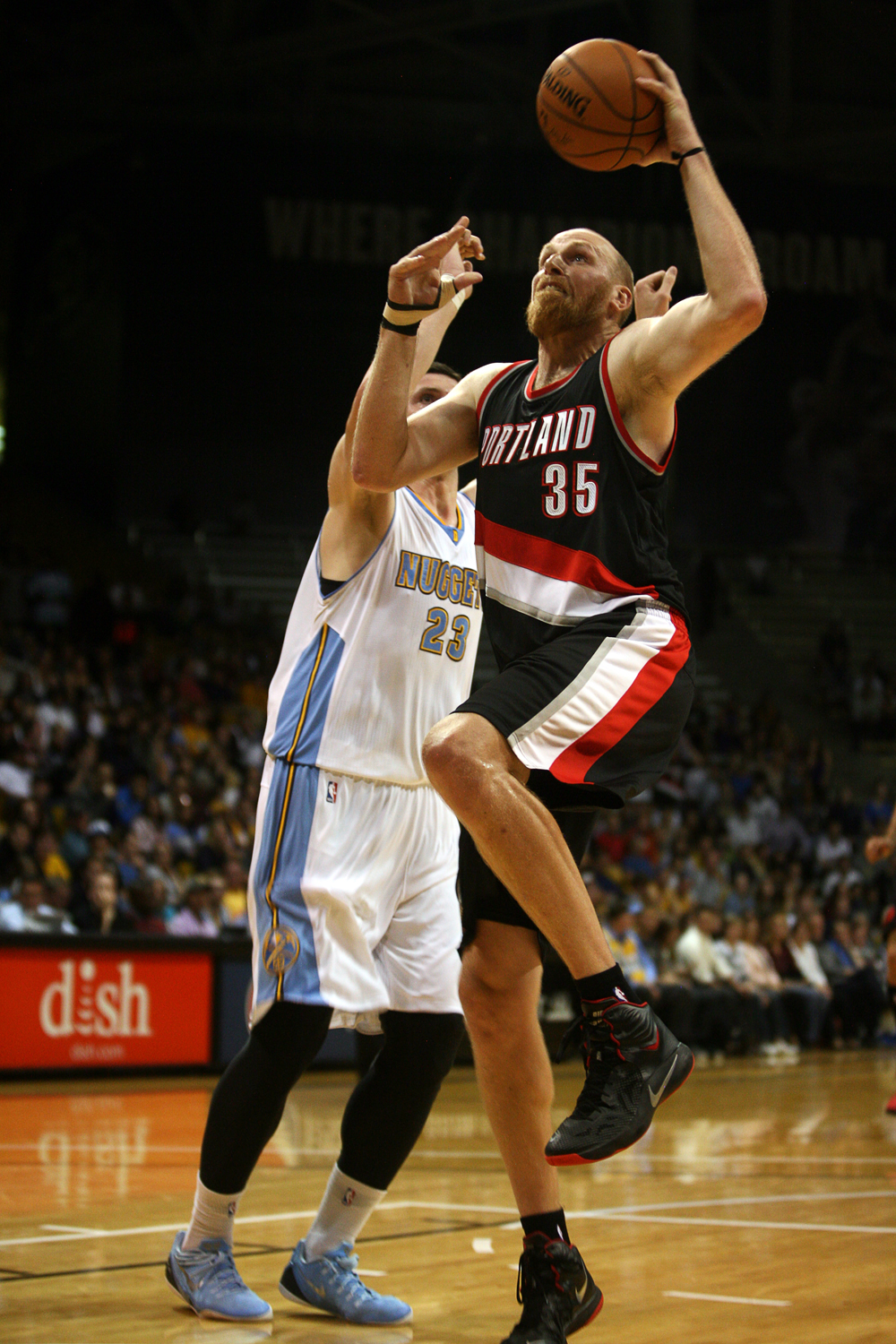 Portland Trail Blazers center Chris Kaman jumps for a layup. Kaman managed to snag seven rebounds in his 13 minutes of playing time. (Kai Casey/CU Independent)