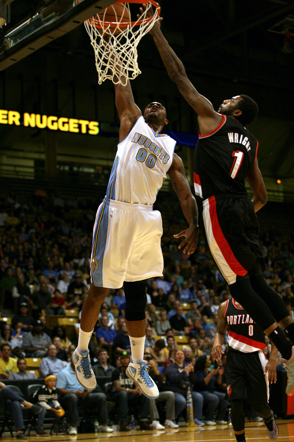 Denver Nuggets forward Darrell Arthur dunks the ball over Portland Trail Blazers forward Dorell Wright. Arthur only came in for 13 minutes, but was able to finish with 10 points. (Kai Casey/CU Independent)