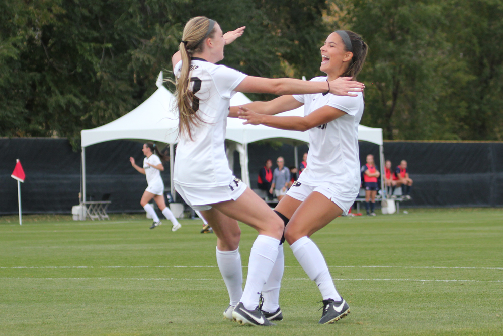 Junior midfielder Olivia Pappalardo runs to embrace freshman forward Brittney Stark during Sunday’s game in Boulder. Stark had just scored the second goal of the game against Arizona, giving the Buffs a one-goal lead. (Jade Lang/CU Independent)