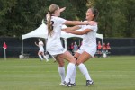 Junior midfielder Olivia Pappalardo runs to embrace freshman forward Brittney Stark during Sunday’s game in Boulder. Stark had just scored the second goal of the game against Arizona, giving the Buffs a one-goal lead. (Jade Lang/CU Independent)