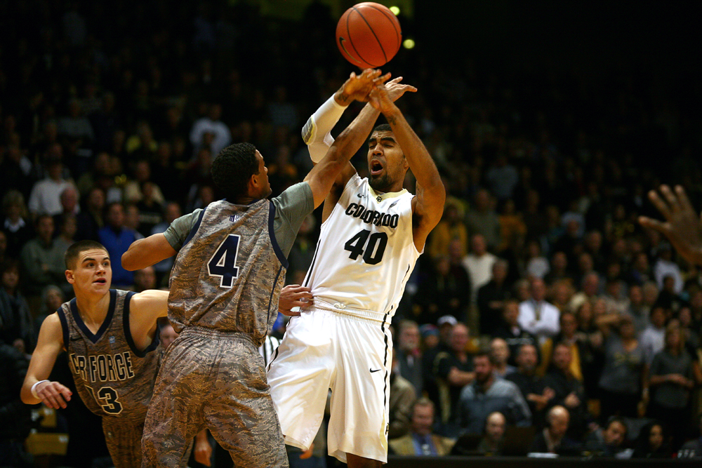 Air Force senior forward Kamryn Williams (4) knocks the ball away from Colorado junior forward Josh Scott (40) during an NCAA men’s basketball game between Colorado and Air Force, Tuesday, Nov. 25, 2014, at the Coors Events Center in Boulder, Colo. (Kai Casey/CU Independent)