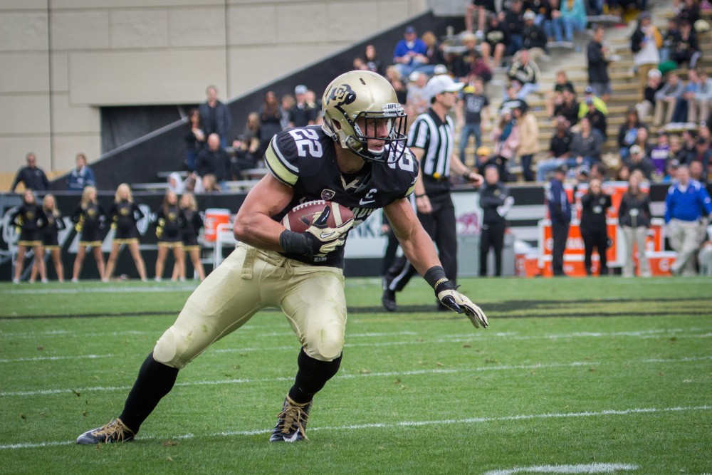 Junior wide reciever Nelson Spruce looks for a way out during a play. Spruce was the leading reciever with 13 catches for 138 yards. (Matt Sisneros/CU Independent)