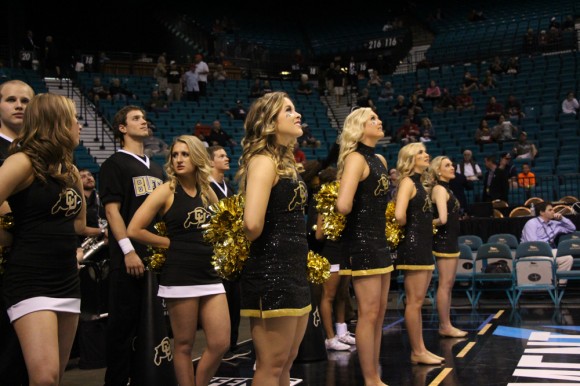 Members of the Colorado Spirit Squad line up for the first game for the Buffs in the MGM Grand Arena. (Gray Bender/CU Independent)