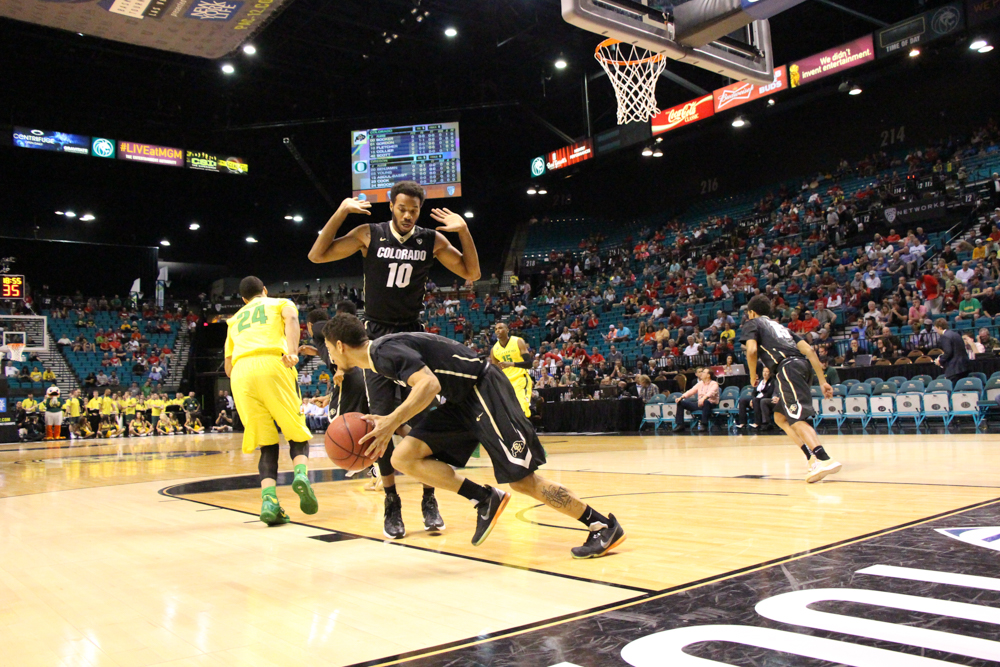 Senior Askia Booker maneuvers around teammate Tre’Shaun Fletcher during Thursday’s second round game against Oregon. (Gray Bender/CU Independent) Grayson Bender