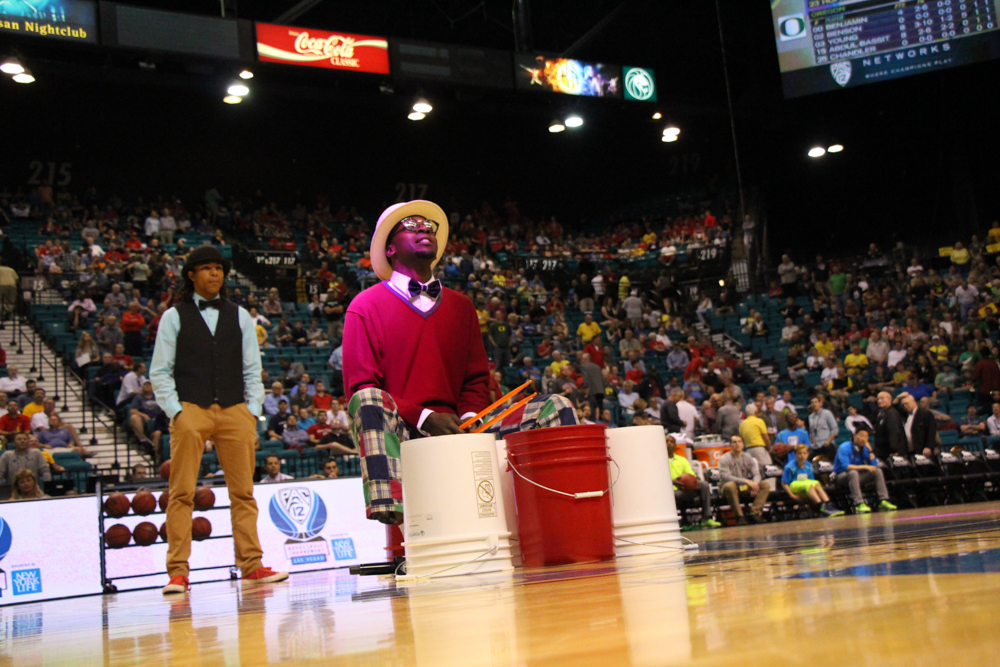 Las Vegas performers Peter Rabbit and Snap Boogie keep the MGM Grand Arena energy high during halftime on Thursday, March 12, 2015. (Gray Bender/CU Independent) Grayson Bender