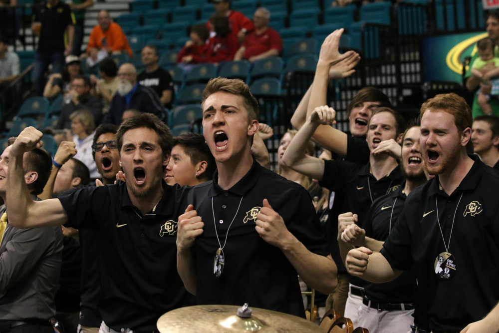 Members of the Buff Basketball Band cheer before the players take the court in the MGM Grand Arena on Thursday, March 12, 2015. (Gray Bender/CU Independent) Grayson Bender