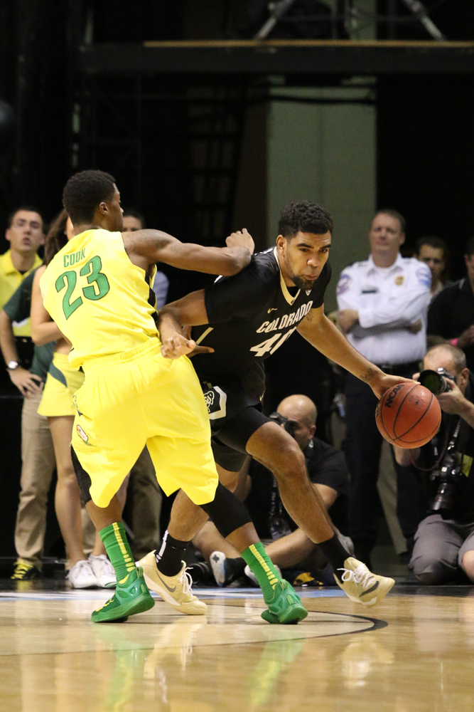 Junior Josh Scott dribbles past Oregon’s Elgin Cook during the first half of the Pac-12 Tournament game. Scott led the team for scoring with 16 points. (Gray Bender/CU Independent) Grayson Bender