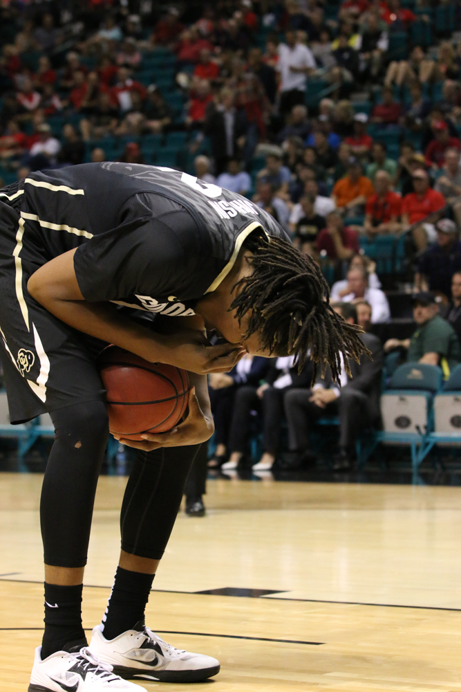 Junior Xavier Johnson recovers after being hit by an Oregon foul in the first half. (Gray Bender/CU Independent) Grayson Bender