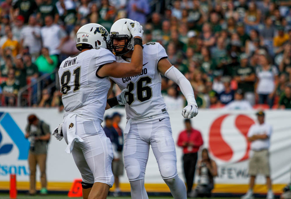Dylan Keeney (86) and Sean Irwin (81) celebrate after a Buff’s Touchdown during Saturdays Game against CSU. CU won 27-24. (Danny Anderson / CU Independent) Elizabeth Rodriguez
