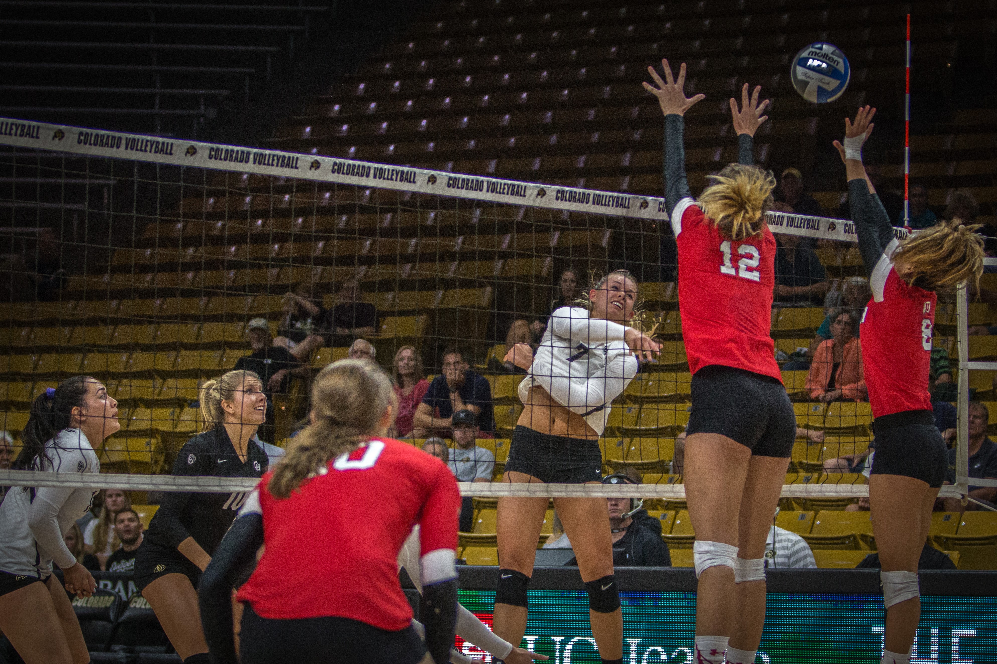 Sophomore Alexa Smith spikes the ball during the Buffs’ 2-3 loss to the Utah Utes on Wednesday, Sept. 21, 2016. (Robert Hylton/CU Independent) Nigel Amstock