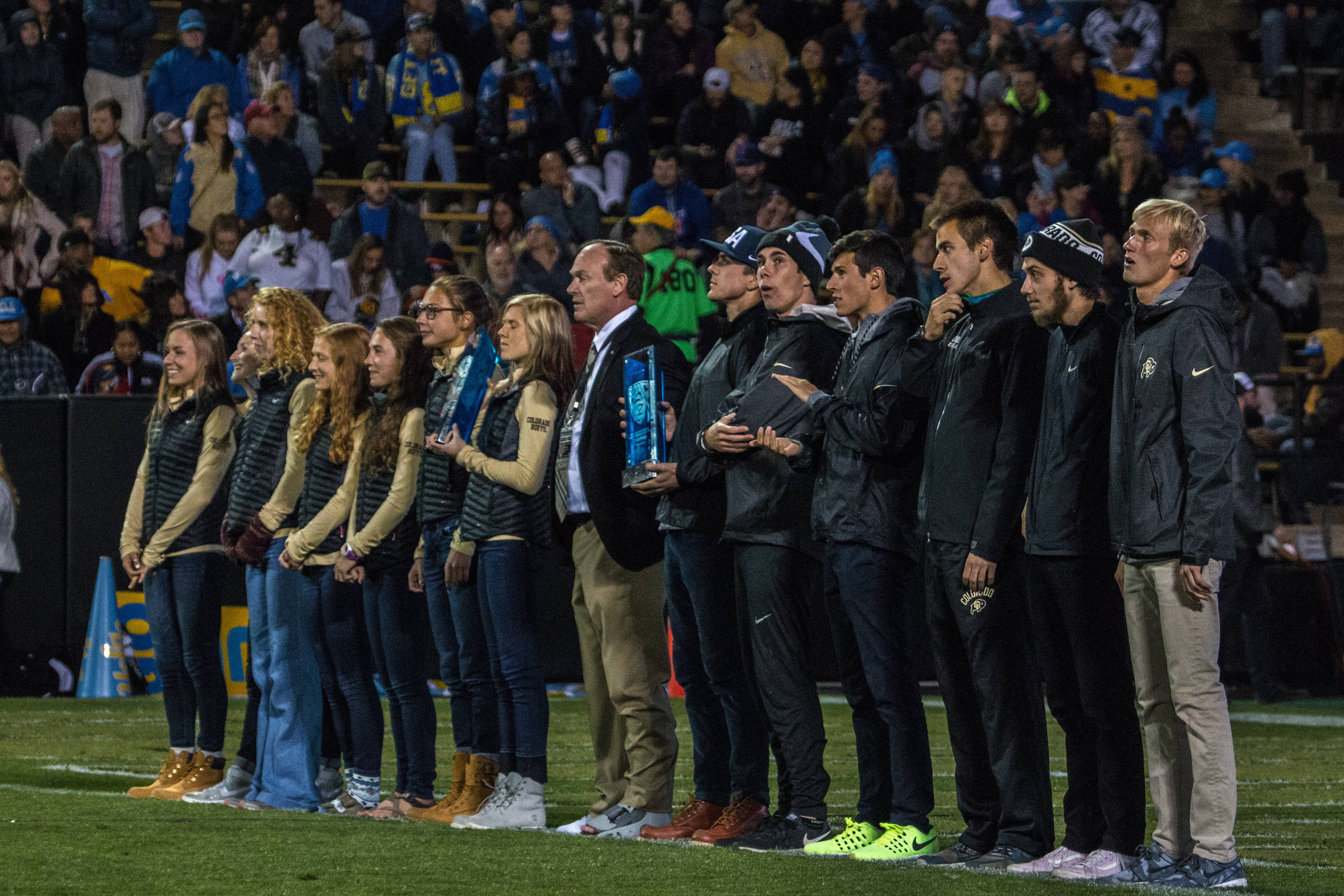 The Pac-12 champion CU Cross Country team was honored between plays during the Buff’s 20-10 win over the UCLA Bruins at Folsom Field on Thursday November 3, 2016. (Robert Hylton/CU Independent) Nigel Amstock