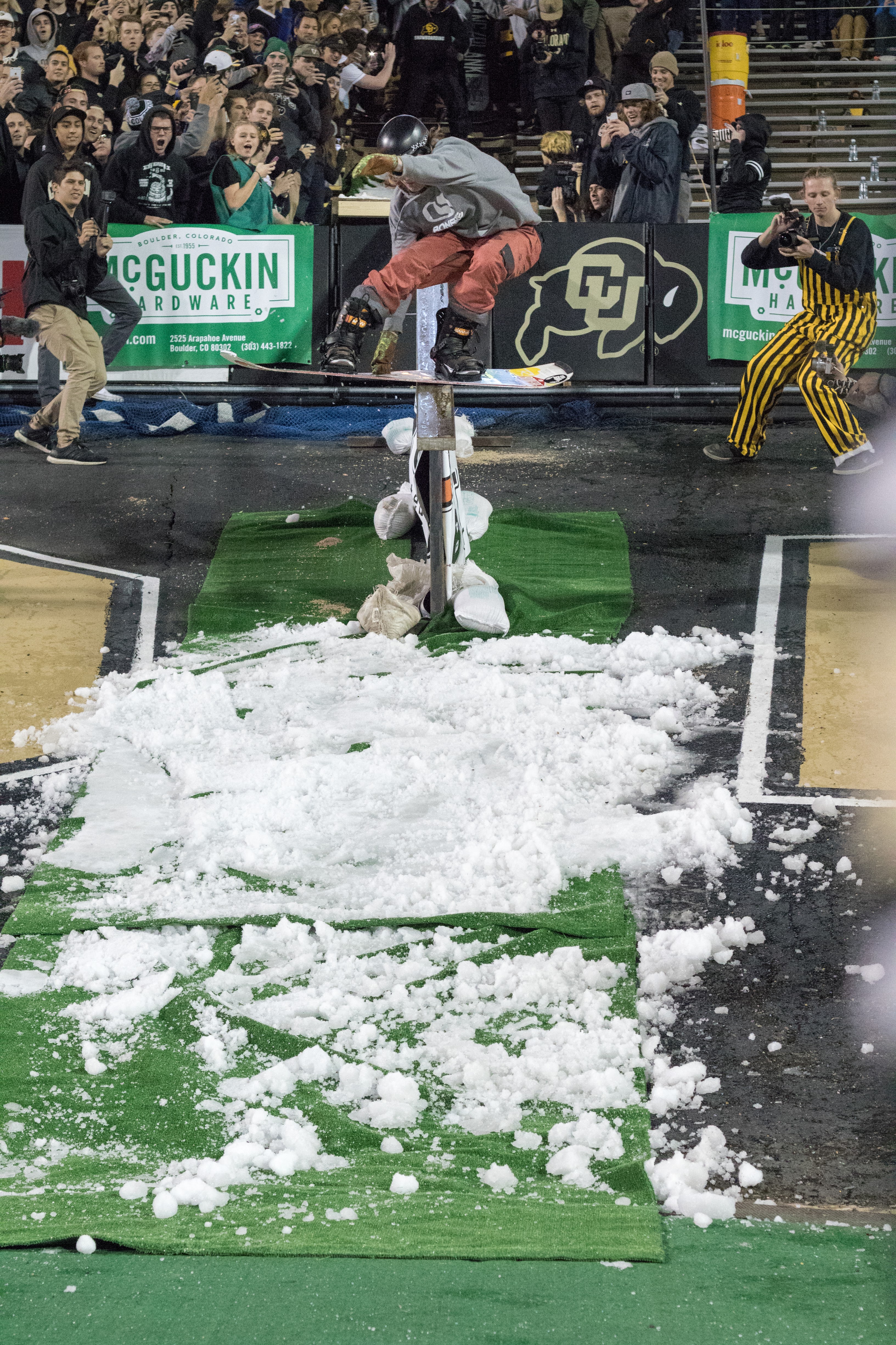 A member of the CU Snowboard Team riding the rail for the annual half time rail jam during CU’s 20-10 victory over UCLA at Folsom Field on Thursday Nov. 4, 2016 (Phillip Mckenzie/CU Independent) Nigel Amstock