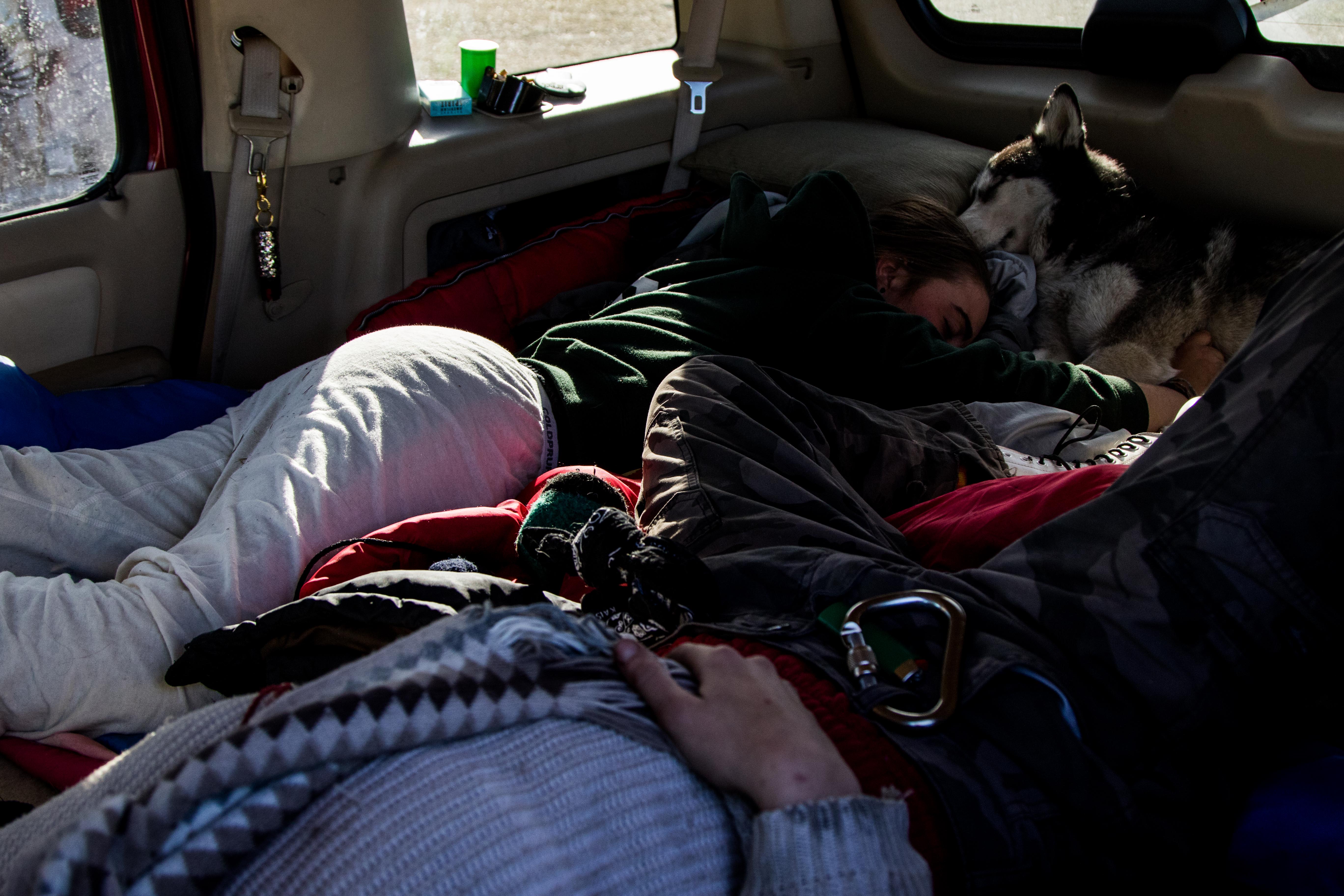Nearly 700 miles north of Boulder, Emily lit a cigarette in the backseat of her SUV. The dirt-coated car was now her home in a ditch on the side of North Dakota Highway 1806, brimmed with blankets, two friends and a dog.