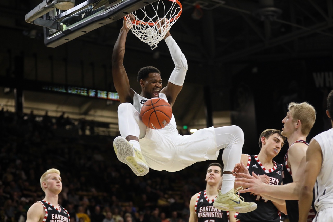 Junior forward Tory Miller-Stewart reacts to a massive dunk during the second half of play at the Coors Event Center. Dec. 22, 2016 (Nigel Amstock/CU Independent File) Nigel Amstock