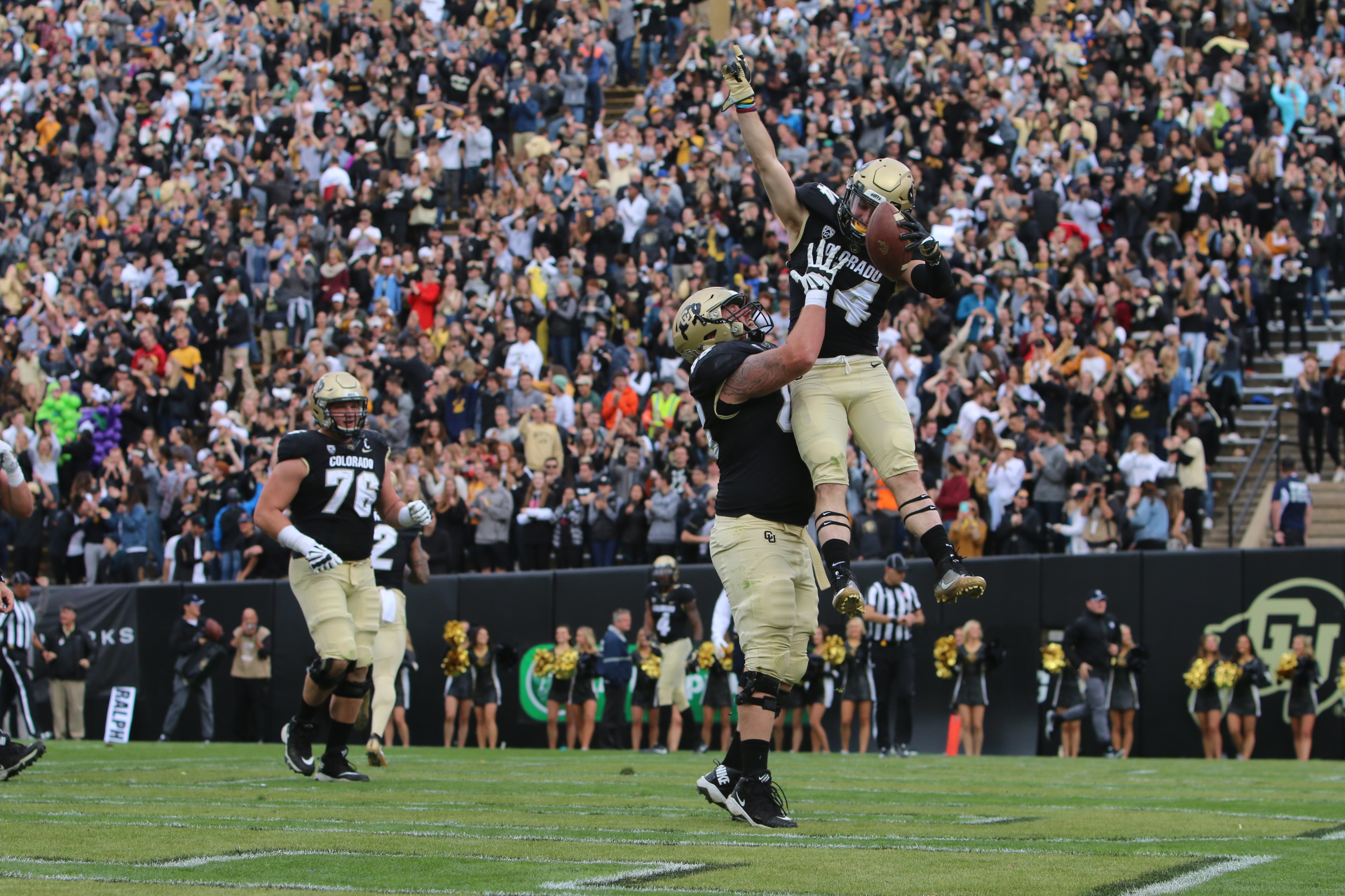 Wide receiver Macintyre is lifted in the air after his touchdown. Oct. 28, 2017 (Fiona Matson/CU Independent)