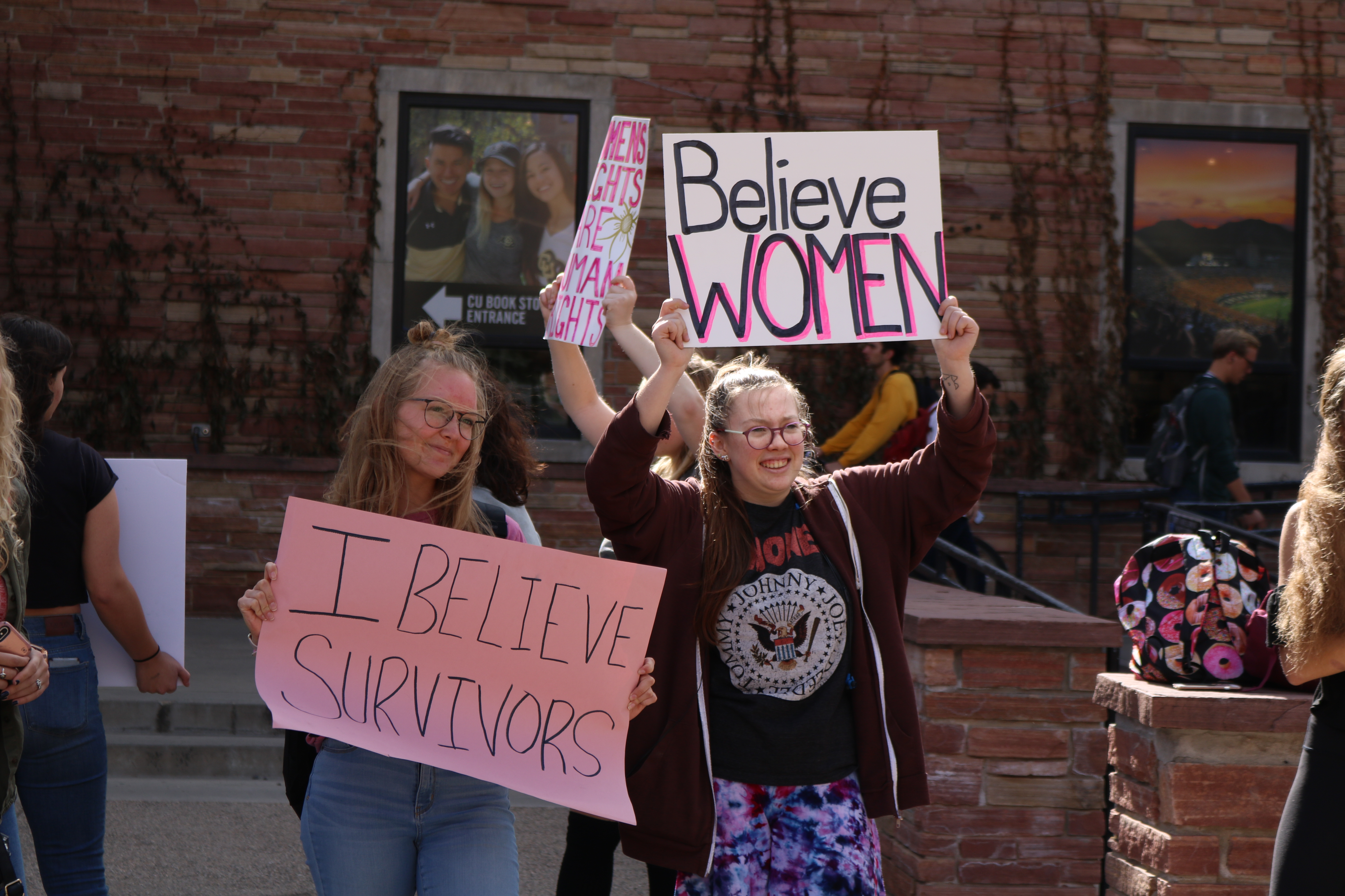 Protesters reference the recent hearings of Brett Kavanaugh, then-nominee to the U.S. Supreme Court, and ask for the community to listen to survivors of sexual violence. Oct. 25, 2018. (Lucy Haggard/CU Independent)