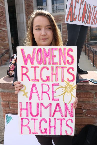 A protester holds a sign calling for equitable treatment of women-identified students as part of improved safety on and off campus. Oct. 25, 2018. (Lucy Haggard/CU Independent)